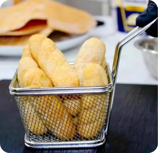 Palitos de queso rebozado, mojados en salsa.