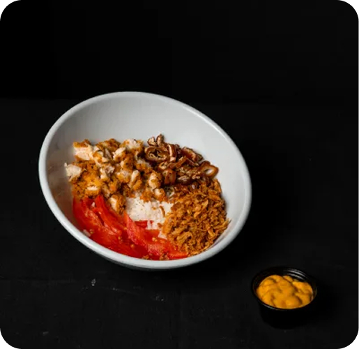 Arroz, pollo rebozado, dátiles, cebolla frita, tomate y salsa.